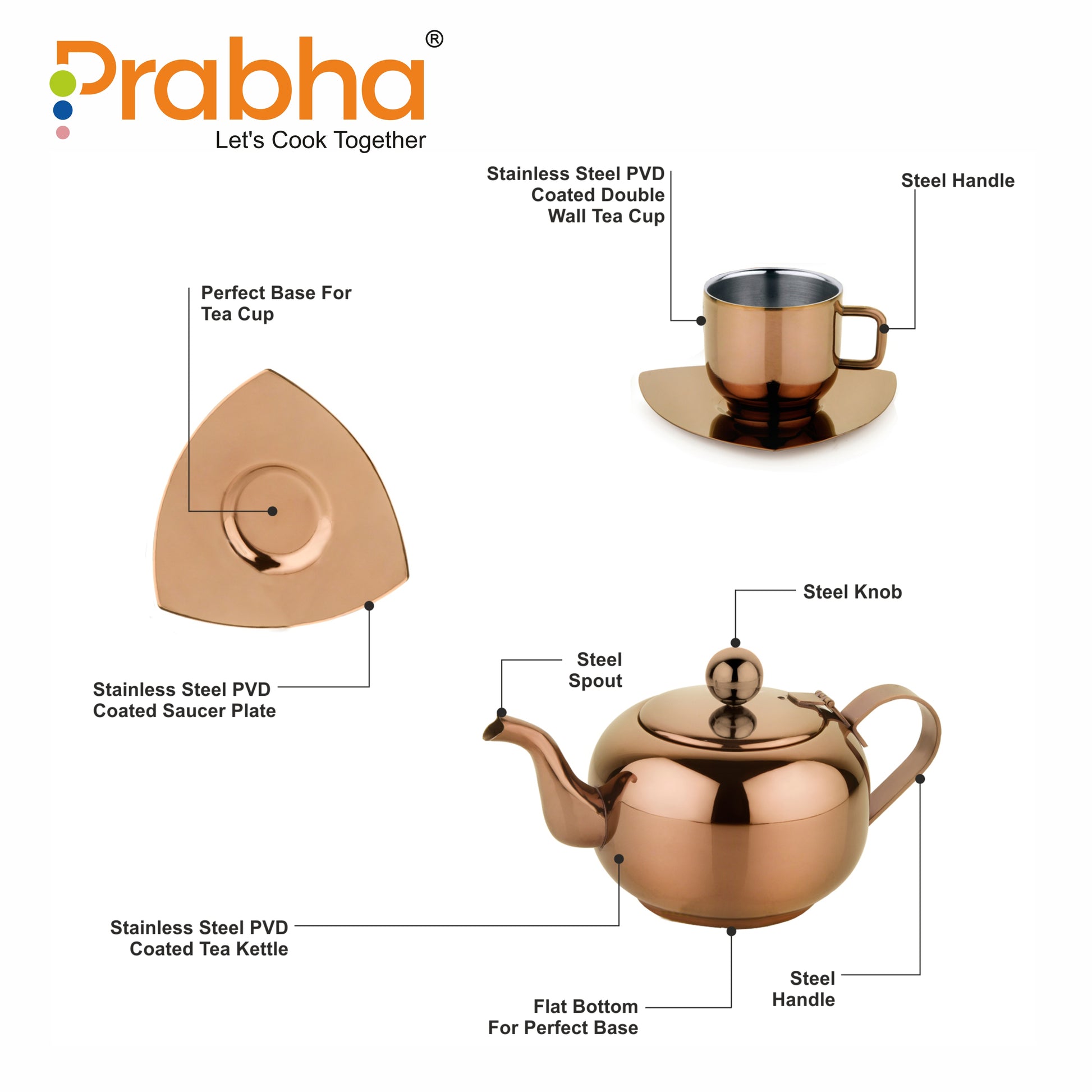 Stainless Steel Tea Kettle With Cup & Saucer Set - PVD Rose Gold Coating