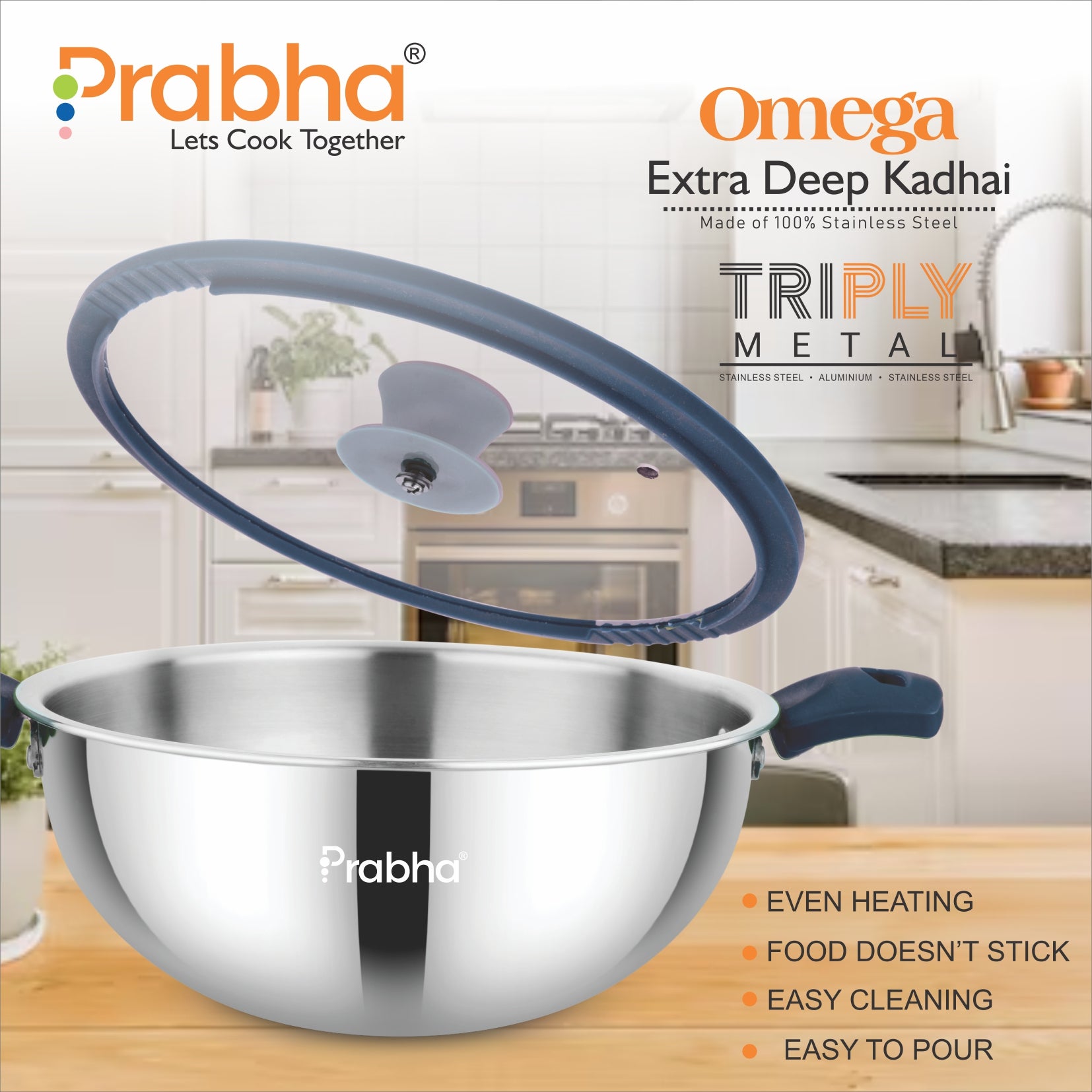 - Item Name: Omega Tri-Ply Extra Deep Kadhai With Glass Lid